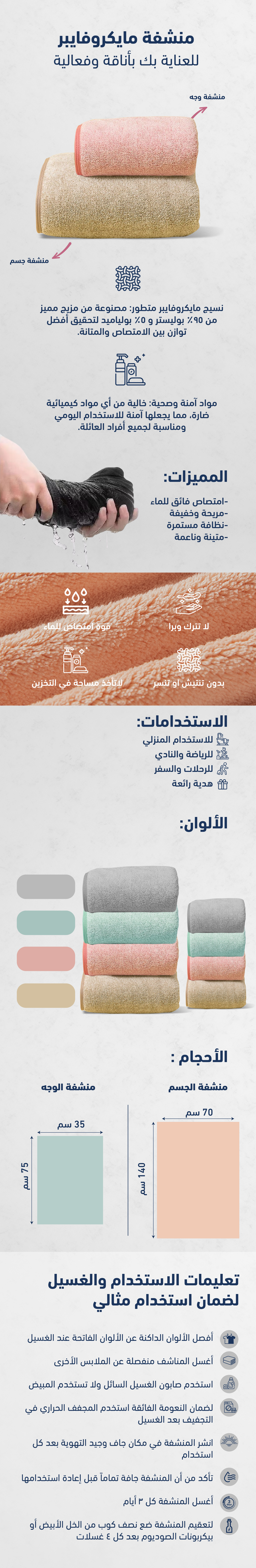 - امتصاص فائق للرطوبة: تجف بسرعة وفعالية.
